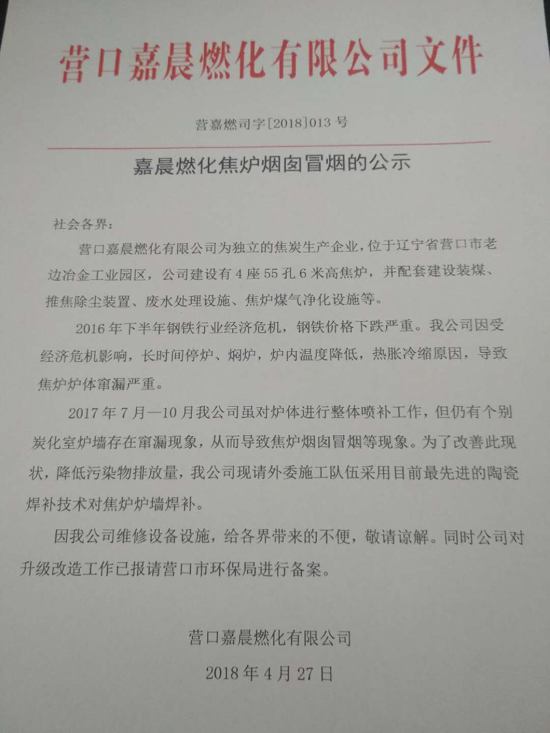 營口嘉晨燃化焦?fàn)t煙囪冒煙的公示