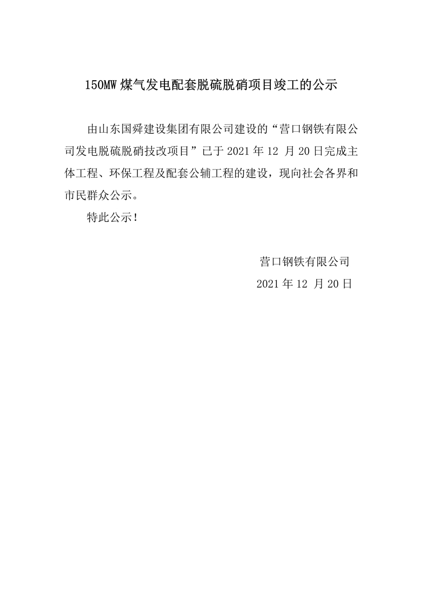 150MW煤氣發(fā)電配套脫硫脫硝項(xiàng)目竣工的公示